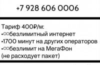 Тариф:На мегафон России безлимит, минуты с пакета не расходуются, 400 минут на других операторов России и безлимитный интернет. Аб.плата 400р в месяц С официальным оформлением