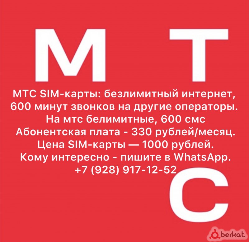 с оформлением С ОФОРМЛЕНИЕМMTC SIM-карты: безлимитный интернет, 600 минут звонков на другие операторы. На мтс белимитные, 600 смс Абонентская плата - 330 рублей/месяц. Цена SIM-карты — 1000 рублей. Кому интересно - пишите в WhatsApp. +7 (928) 917-12-52