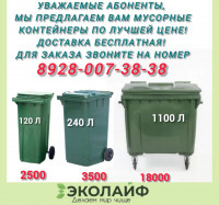 продажа мусорных контейнеров (евроконтейнеров) по выгодным ценам! в наличии новые и качественные пластиковые контейнеры для тбо: 1100 литров: идеально для многоквартирных домов, предприятий, торговых центров. цена: 18 000 руб. 240 литров: оптимальный выбор для частных домов, небольших офисов, дачных кооперативов. цена: 3 500 руб. 120 литров: компактное решение для индивидуального использования. цена: 2 500 руб. все контейнеры с крышками и колесами. доставка бесплатная! звоните и заказывайте! 8928 007 38 38